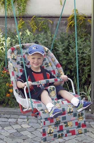Dítě je v houpačce zabezpečeno hrazdičkou, mezinožním klínem a upínacími H-popruhy.